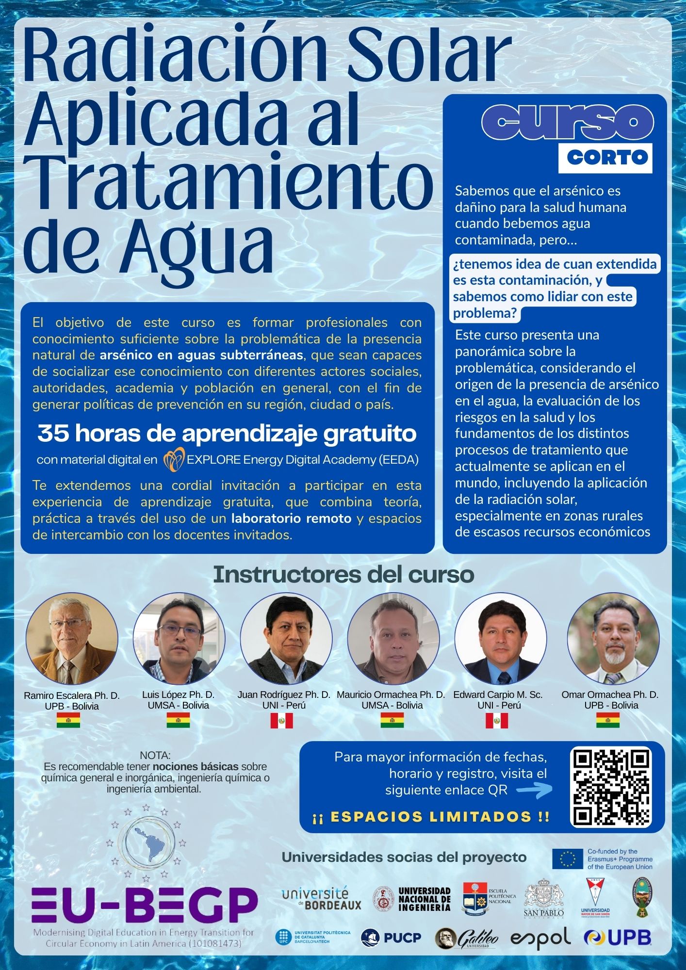 El curso corto «Radiación Solar Aplicada al Tratamiento de Agua» se desarrolla a través de la EXPLORE Energy Digital Academy (EEDA) y reune a participantes de toda América Latina durante 35 horas de formación gratuita, accesible y de gran impacto para comunidades y profesionales del sector. Este espacio formativo se ha convertido en un punto de encuentro para estudiantes, técnicos y especialistas interesados en soluciones innovadoras y sostenibles para el tratamiento del agua.